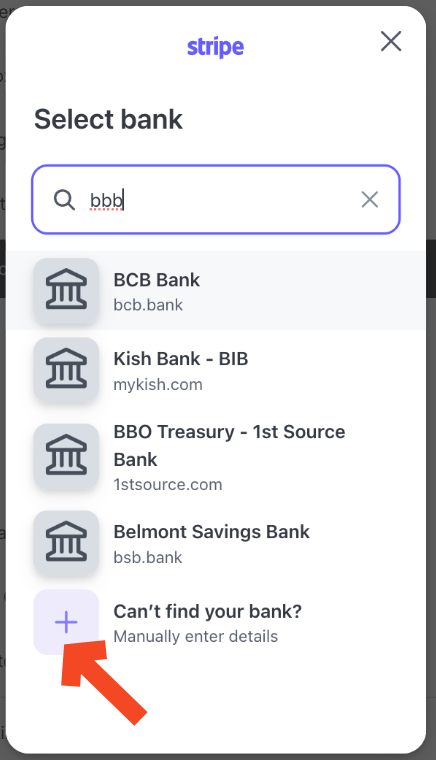 If you can’t find your bank, click the option to manually enter details. Or, click on any bank, then Manually verify instead at the bottom. Enter your Routing and Account numbers.